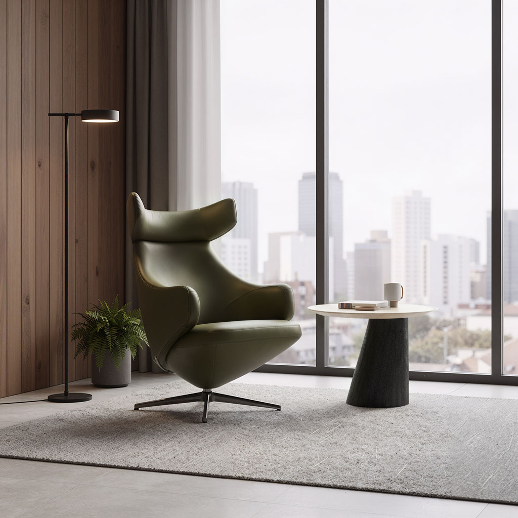 가죽의 섬세한 텍스처와 스틸 하부 프레임의 견고함이 만나, 외부의 힘을 안정적으로
