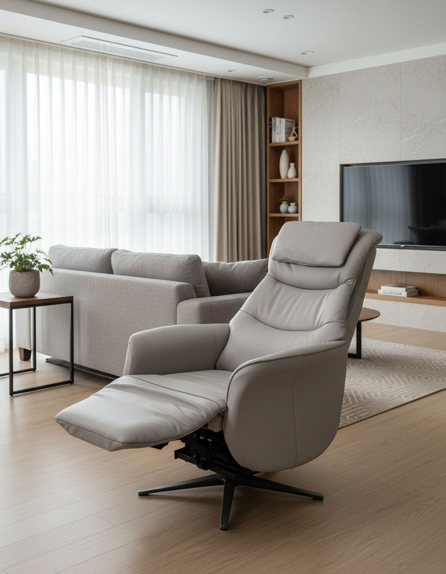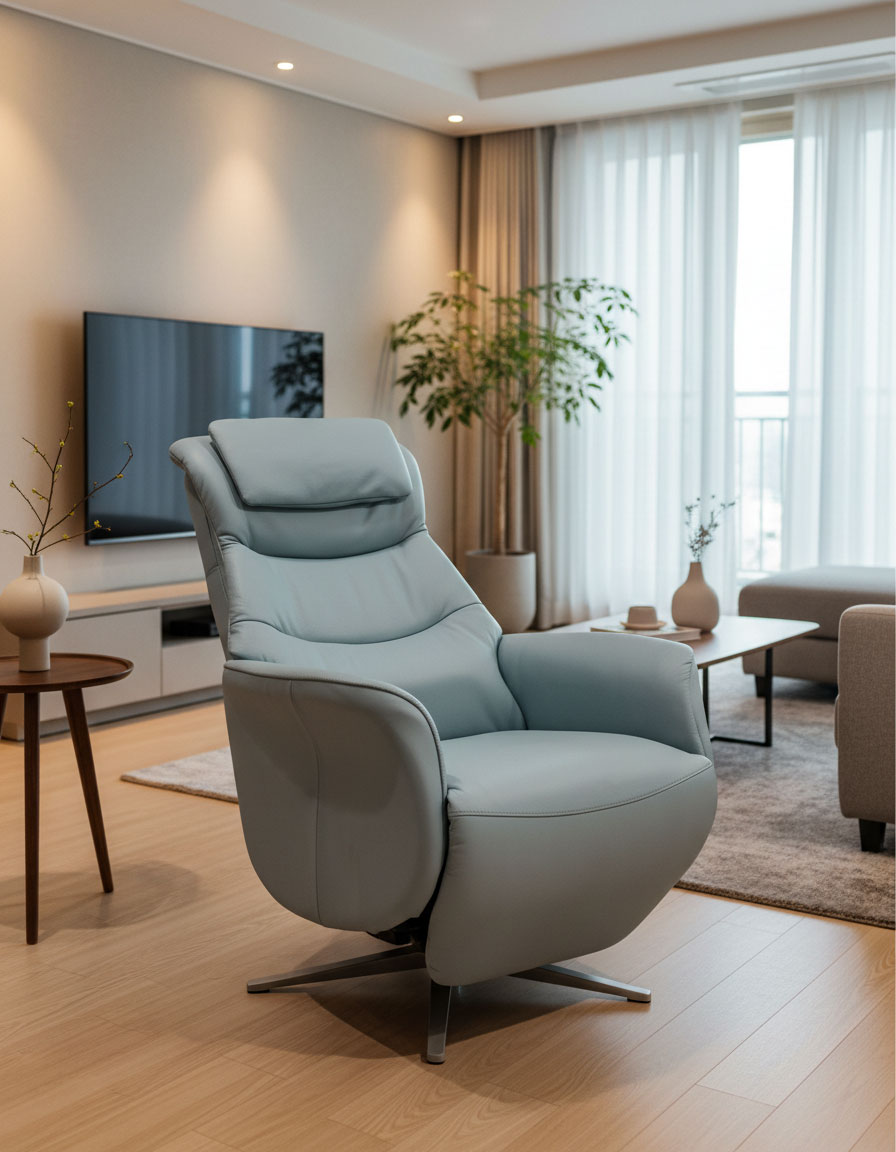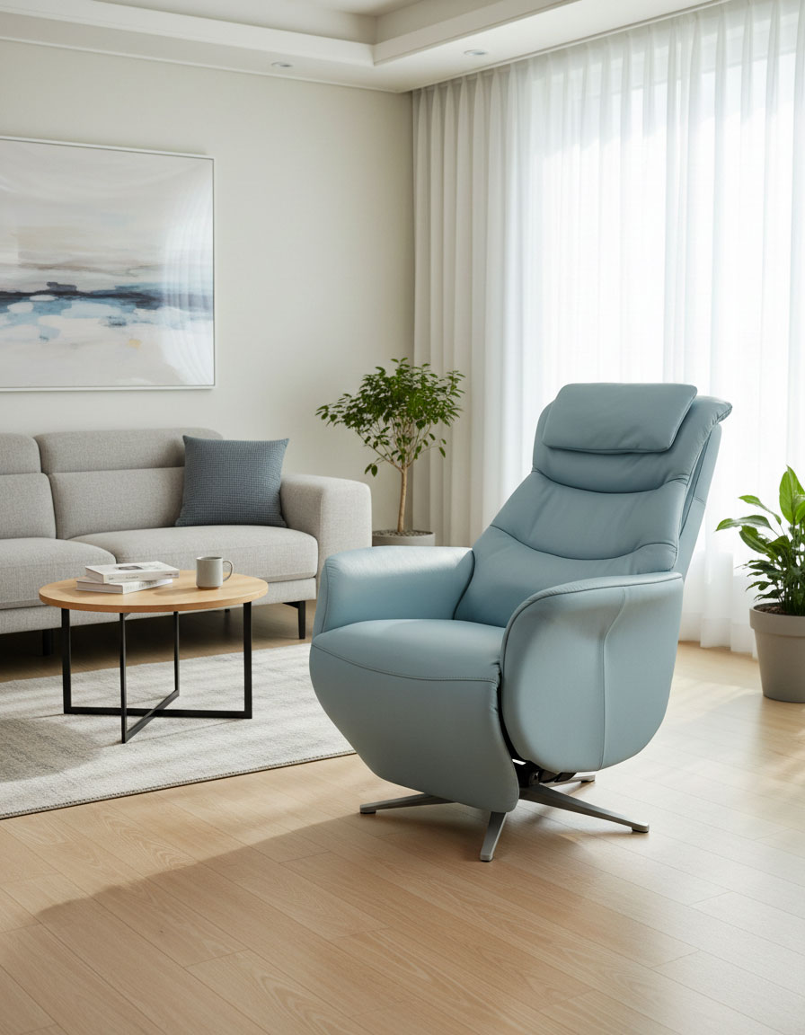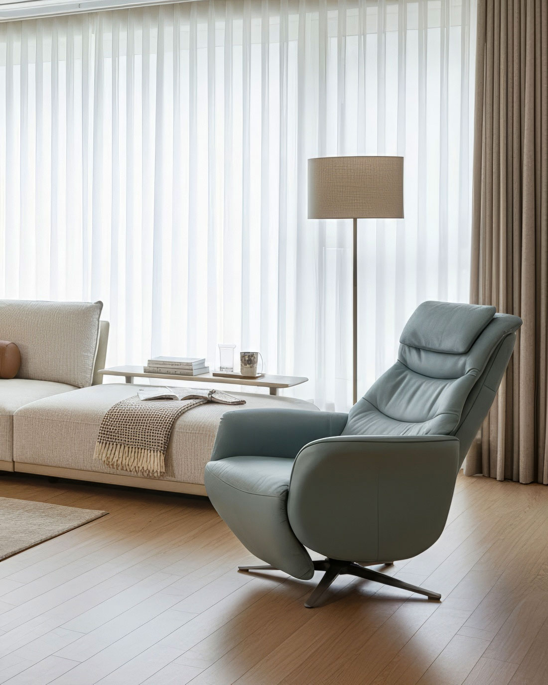 ”캄포트는 공기처럼 가볍게 반응하는 리클라이너입니다. 머리와 허리가 먼저 숨 쉬고, 등과 다리가 뒤따라 흐르죠. 버튼 몇 번이면 몸의 선이 곧 자세가 되고, 어느 각도에서도 우아함을 잃지 않습니다.