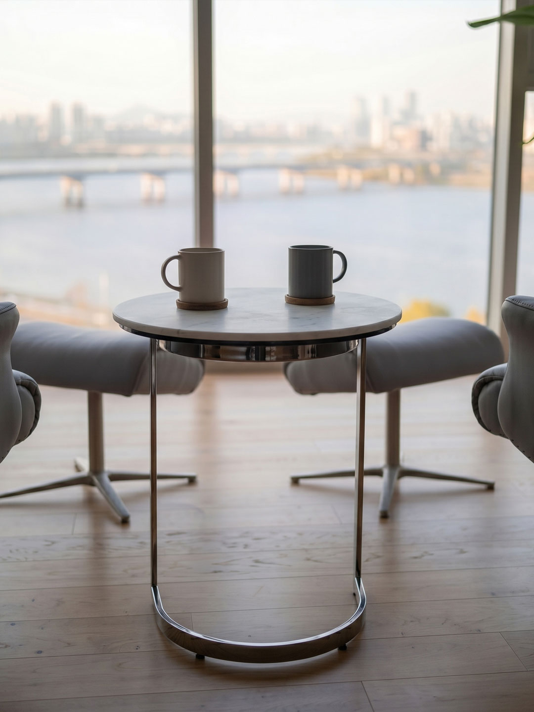 차갑게 반사되는 스틸의 표면 위로 빛의 결이 스며들고 그 위를 따라 곡선은 부드럽게 흐릅니다. 작지만 공간을 바꾸는 힘, 일상 속 작은 쉼표, Curl Table은 그저 테이블이 아닌 공간의 숨결을 담는 하나의 오브제입니다.