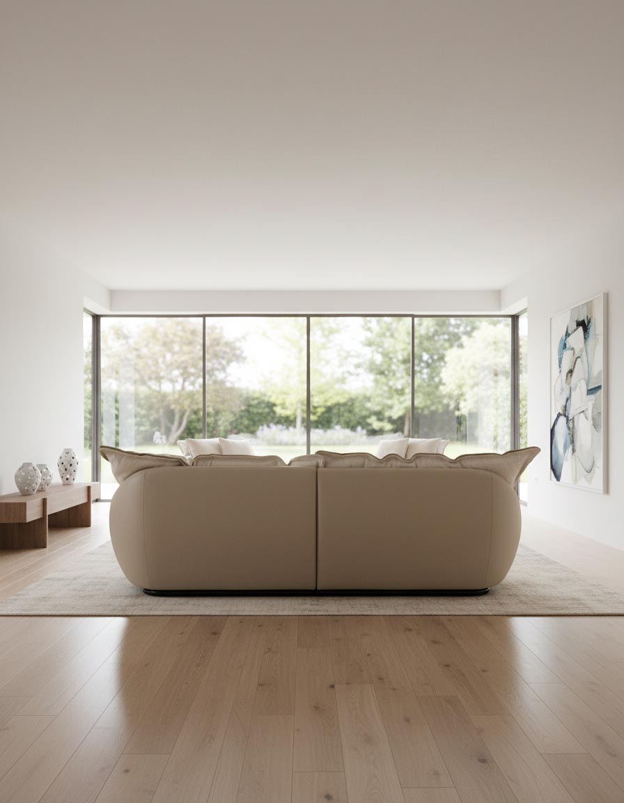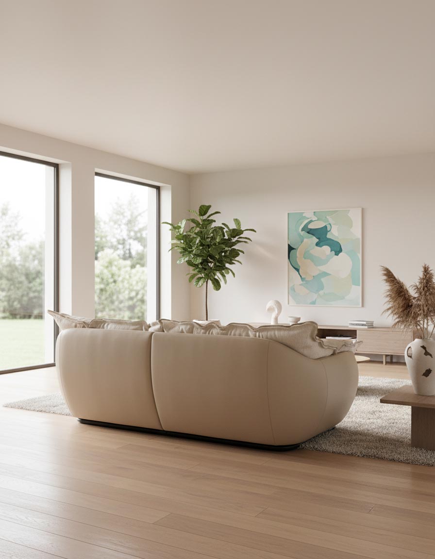 레브 소파의 하부를 전체적으로 감싸는 라운딩 원목 프레임은 단순한 구조를 넘어 특별한 완성도를 보여줍니다. 하나의 곡선 덩어리로 제작된 이 프레임은 정교한 목공 기술과 부드러운 마감이 만나, 사용 공간 어디서든 견고함과 우아함을 동시에 강조합니다.